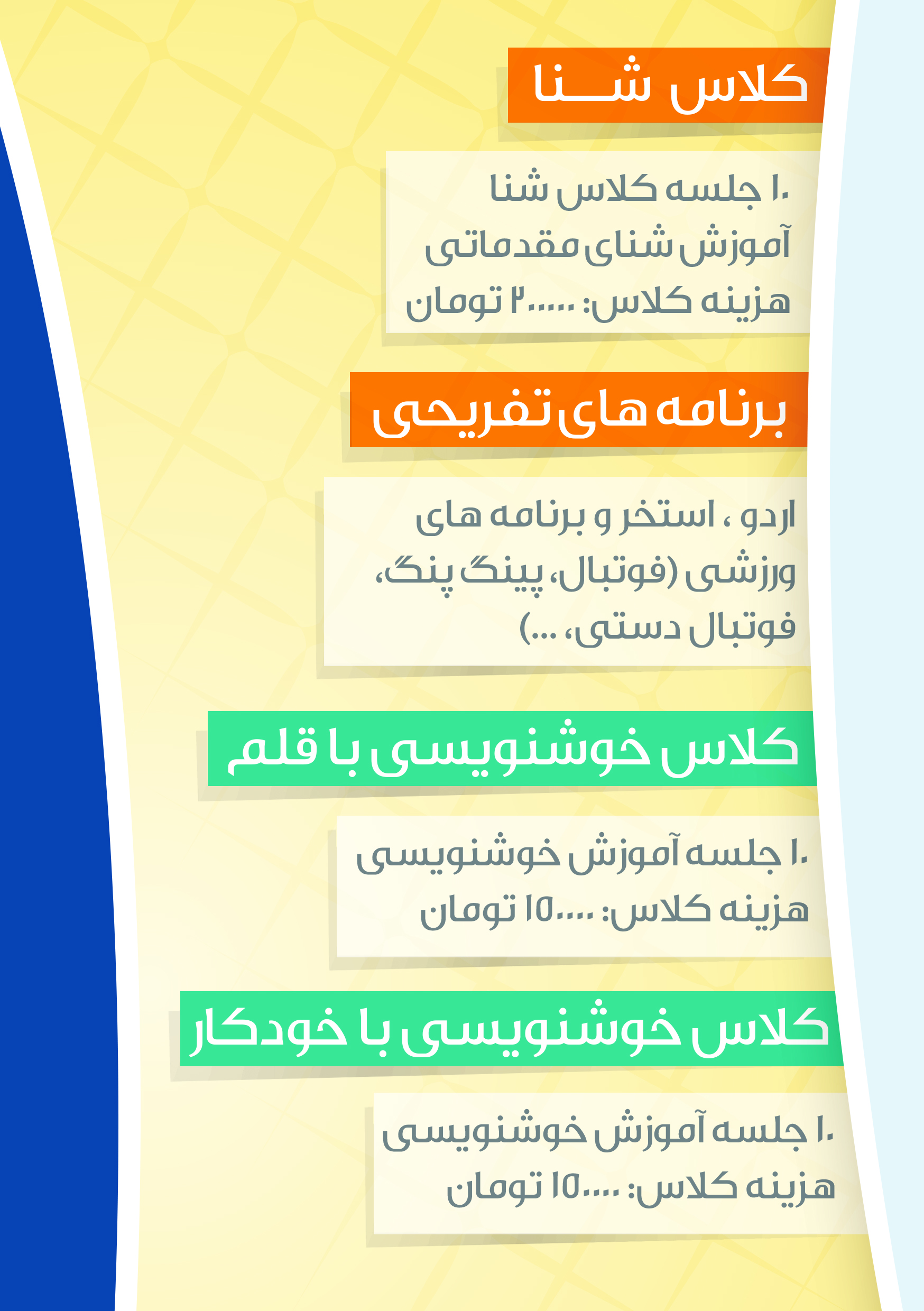 هزینه ثبت نام کلاس های طرح اوقات فراغت 185000تومان